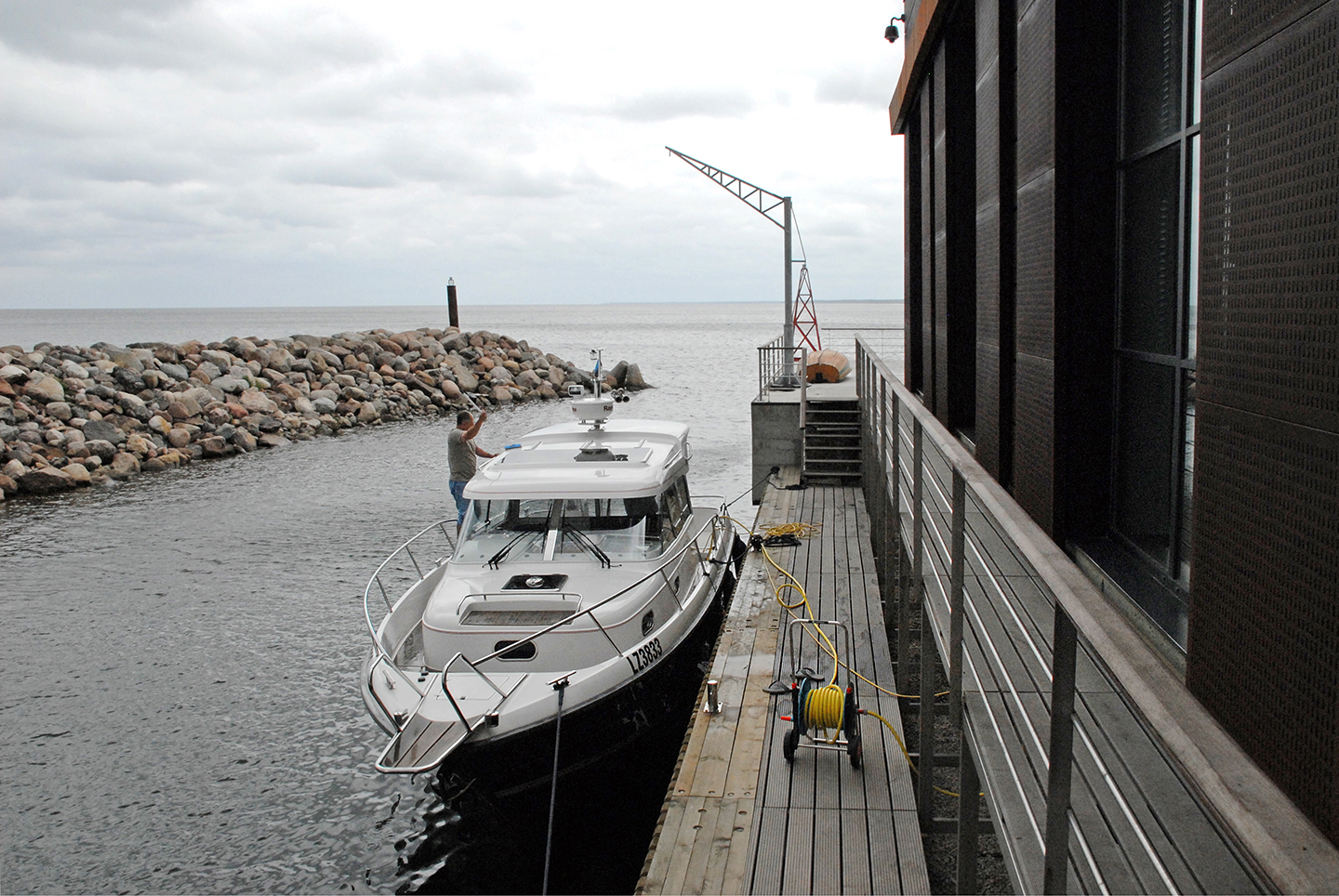 Divstāvu peldu māja, kuras platība ir 52 m2, līdzinās zemūdenes virsbūvei un piedāvā izcilas pirts baudīšanas iespējas. Ēkas āra lodžijā ar skatu uz jūru izvietota arī ūdens vanna.